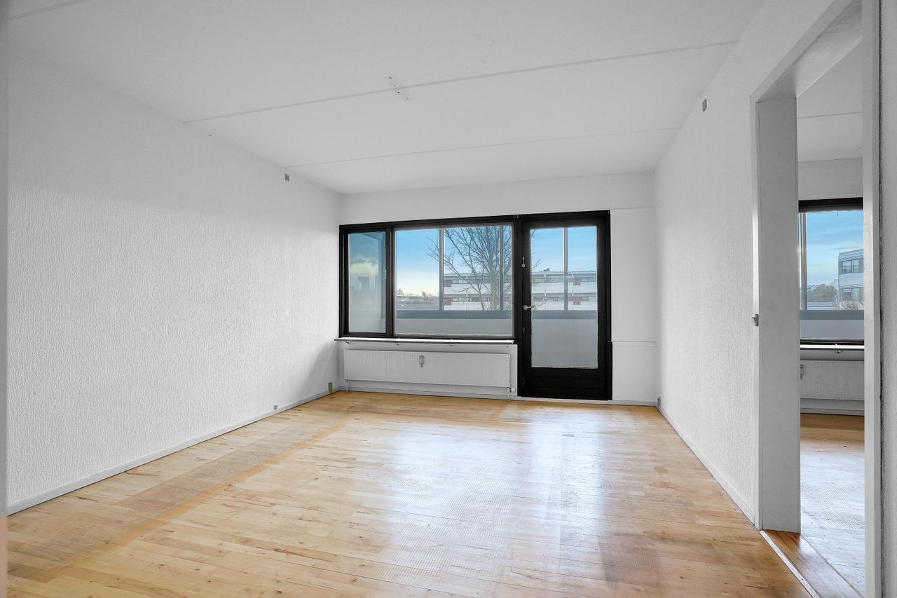 Pladsen i denne lejlighed er veldisponeret. Her er en dejligt luftig rumfornemmelse, der hjælpes på vej af de gavmilde lysindfald og de store, indretningsvenlige rum.
