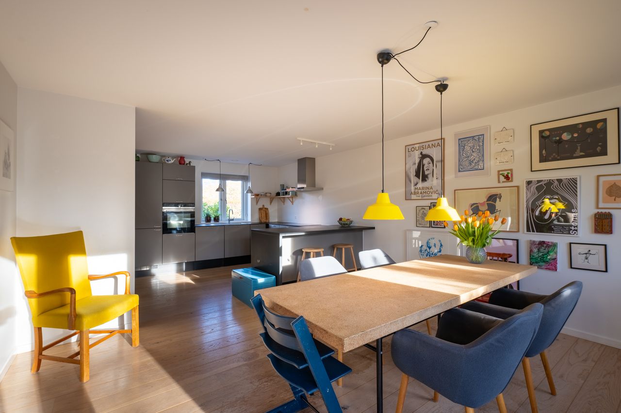 Husets naturlige samlingspunkt er det skønne, åbne og indbydende køkken/alrum i. Det moderne HTH-køkken er stilfuldt indrettet med masser af skabsplads og alt i hårde hvidevarer. Her er der god plads til både madlavning og hyggelige stunder med familie og venner. Fra alrummet er der adgang til en rummelig stue med store vinduespartier, der sikrer et skønt lysindfald hele dagen. På stueplan er der endvidere et stort badeværelse med bruseniche.