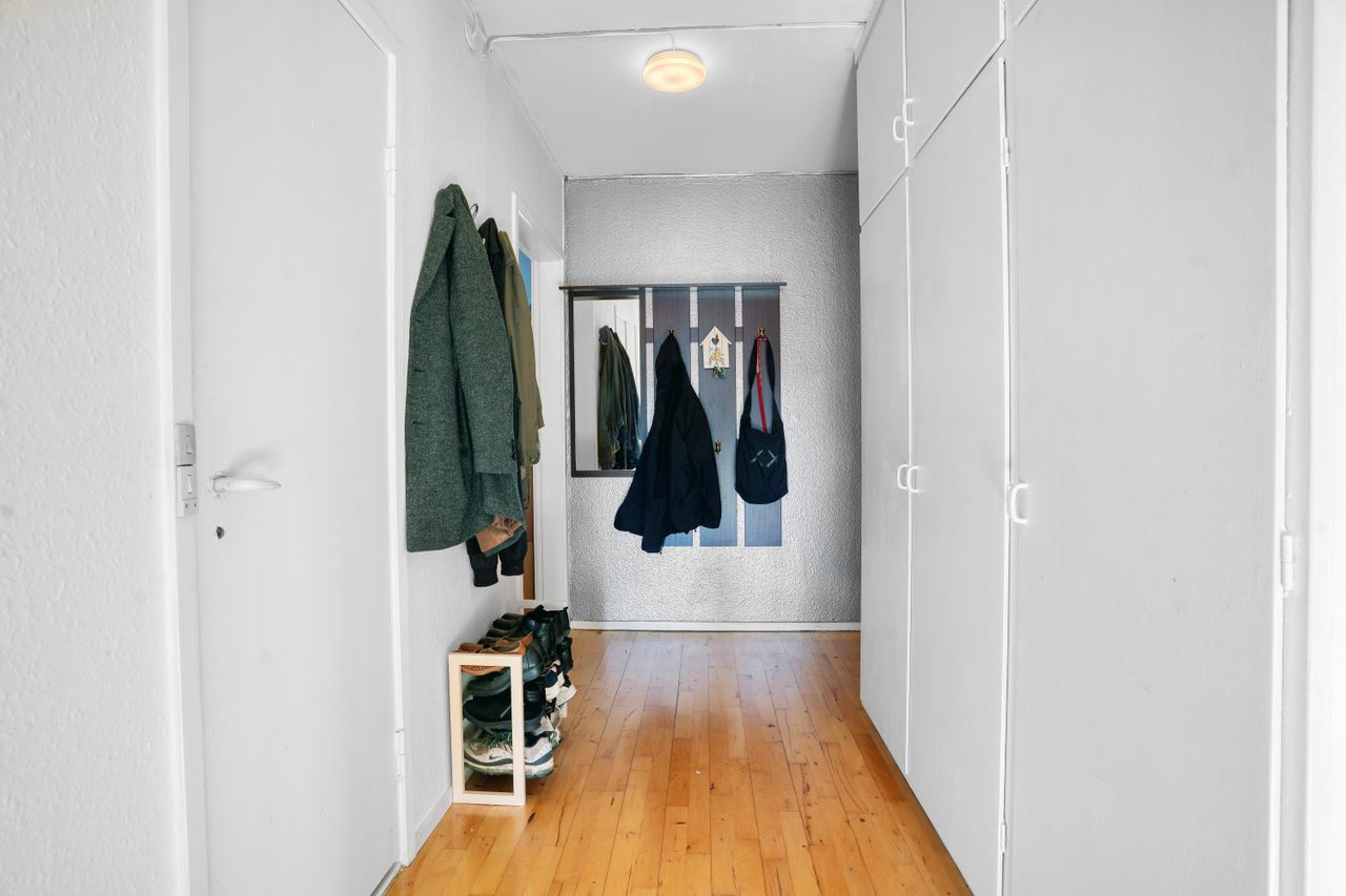 Lejligheden inviterer indenfor via en rummelig entré med god plads til garderobeskab og adgang til boligens resterende rum. Her er badeværelse og toilet delt op for en praktisk løsning, der letter hverdagsmorgenerne, hvor I måske er flere, der skal gøre jer klar på samme tid. Toilettet er flot indrettet med lækre fliser og hængetoilet. Badeværelset med brus og vaskemaskine.