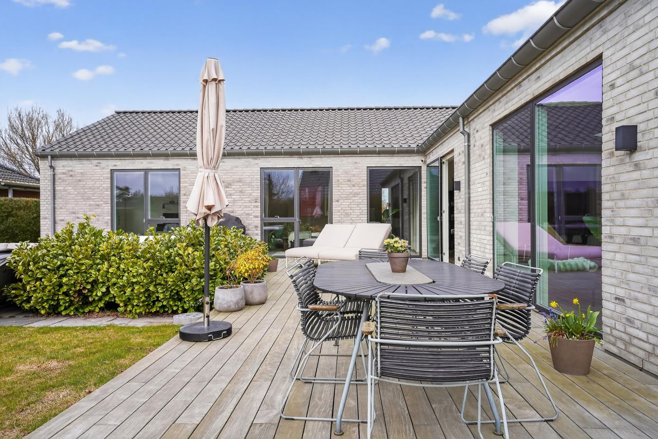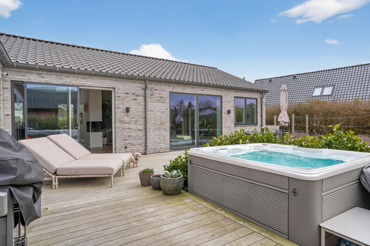 Fra stuen er der store terrasse-skydedøre, som åbner op til den solrige have og en skøn træterrasse, hvor udelivet kan nydes i fulde drag. Haven er anlagt med frugttræer og få bede, hvilket gør den både hyggelig og meget nem at holde. Her finder I også et spa-bad, der giver følelsen af wellness i egen have.
